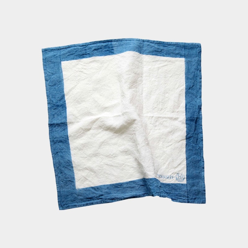 白地のリネンと爽やかなブルーの縁の対比が美しいデザインです。