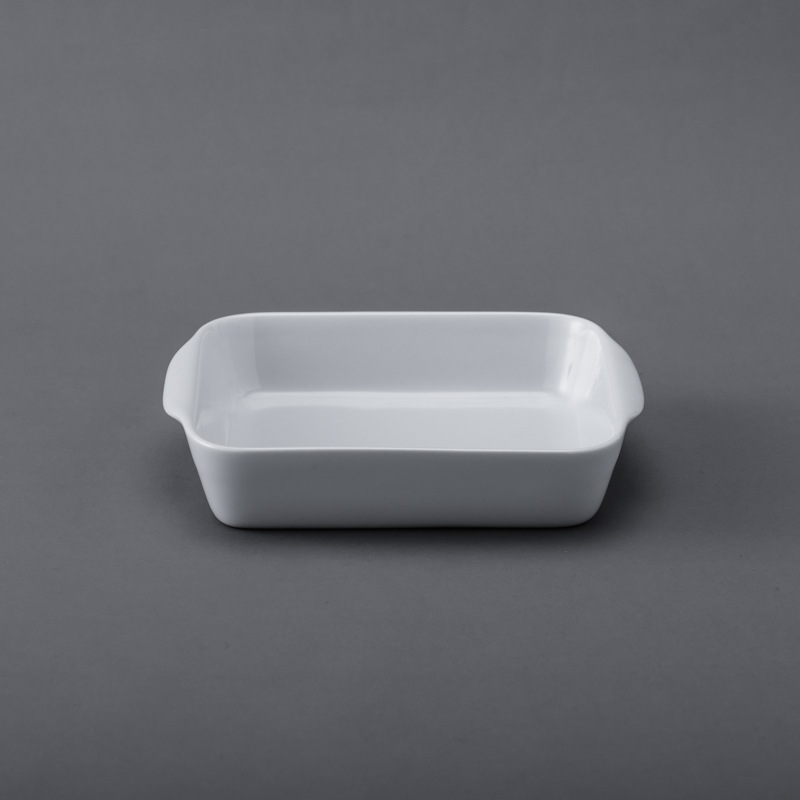 家族で囲むオーブン料理に便利な、シンプルなデザインの四角い白い器。