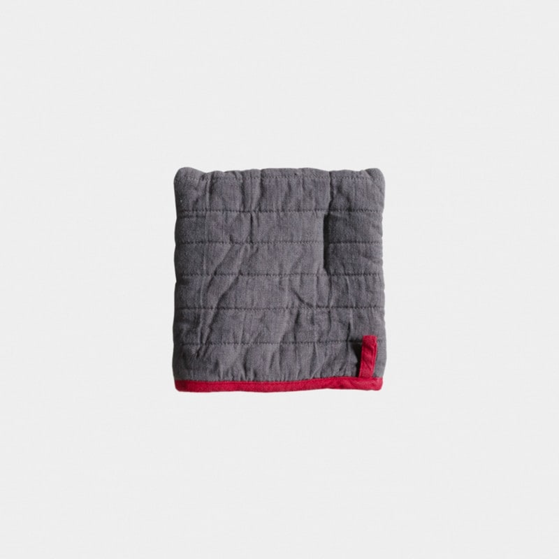 もこもこでふっくら愛らしい正方形のミトン。パイピングとストラップがアクセントになっています。見た目が可愛いだけではなくて、とても実用的。四角でフラットな形は、ポットマットとして使ったり、熱々のプレートの下に敷いたりと、幅広いシーンで活躍してくれます。