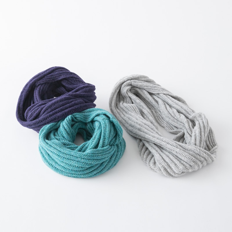 太めの糸でつくられた、リブ編みの幅広タイプのスヌード。