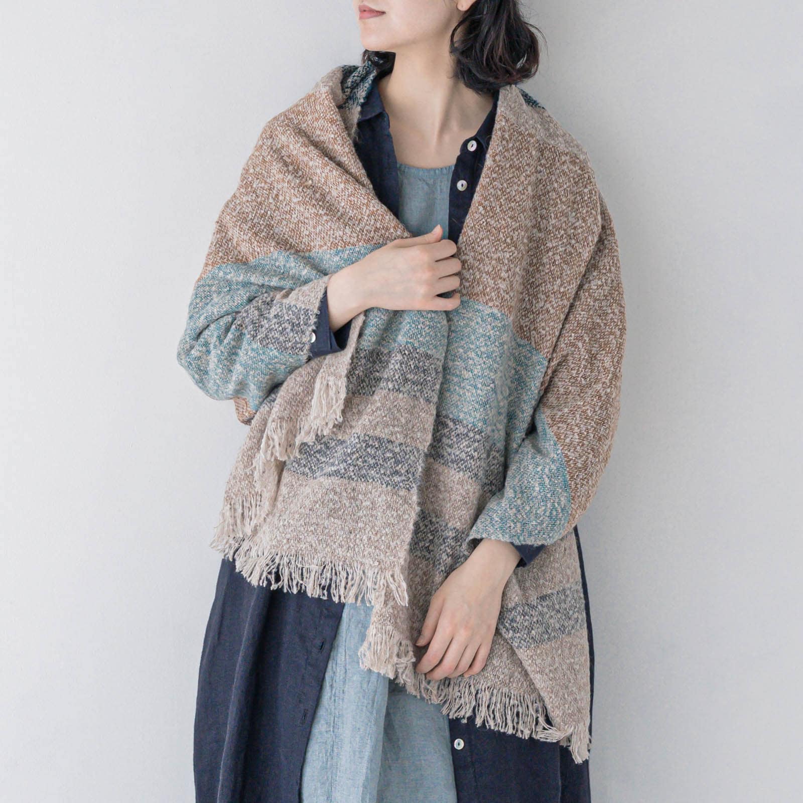 温かみのある色と締め色が綺麗にグラデーションされたストール。沈みがちな秋冬のコーディネートを、華やかに仕立ててくれます。巻き方次第で表情の変化を楽しめます。