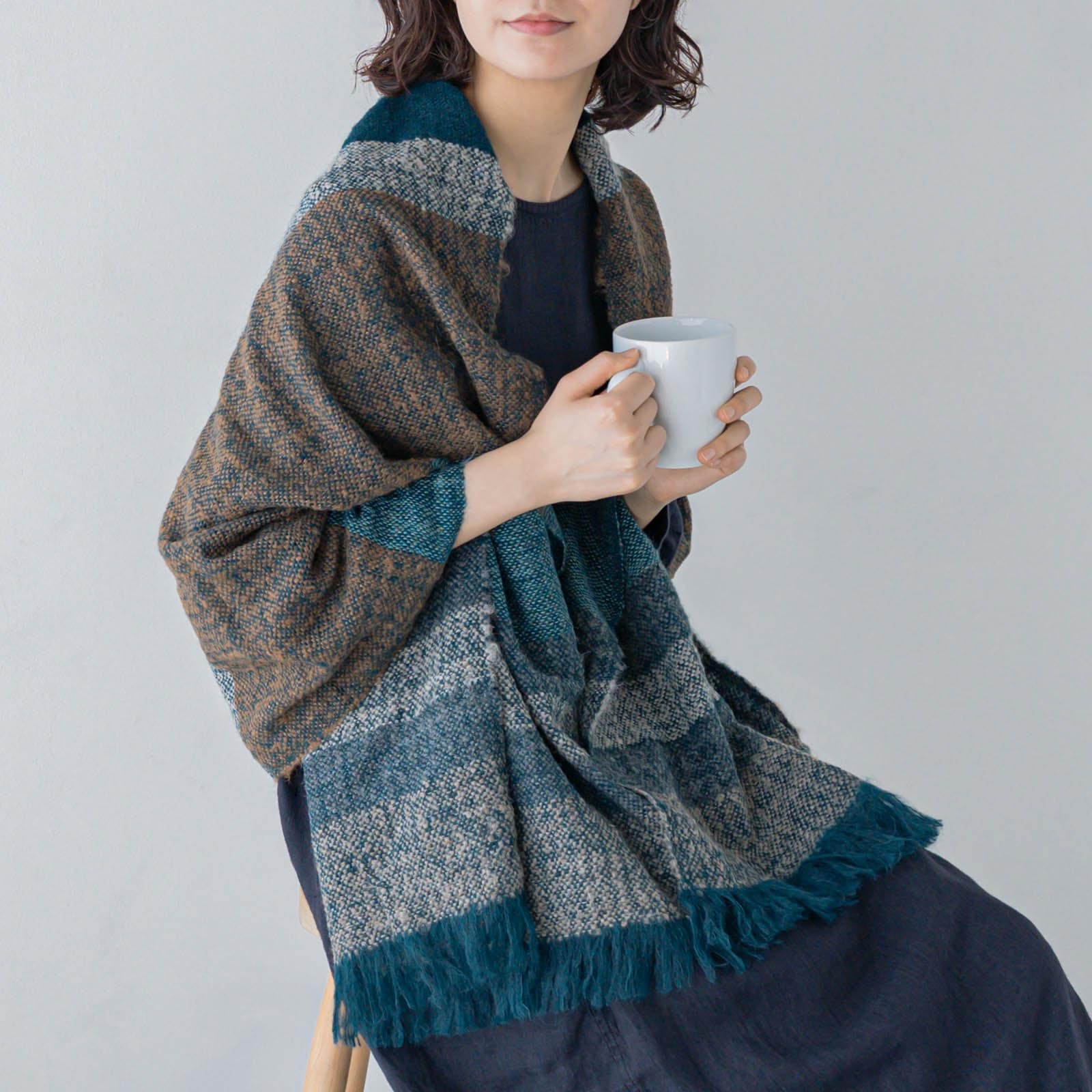 シックな配色でありながら、ビビッドなブルーがアクセントの役目も果たしてくれます。肩からさっと羽織るだけで様になります。軽くて柔らか、丈夫で毛玉になりにくい
