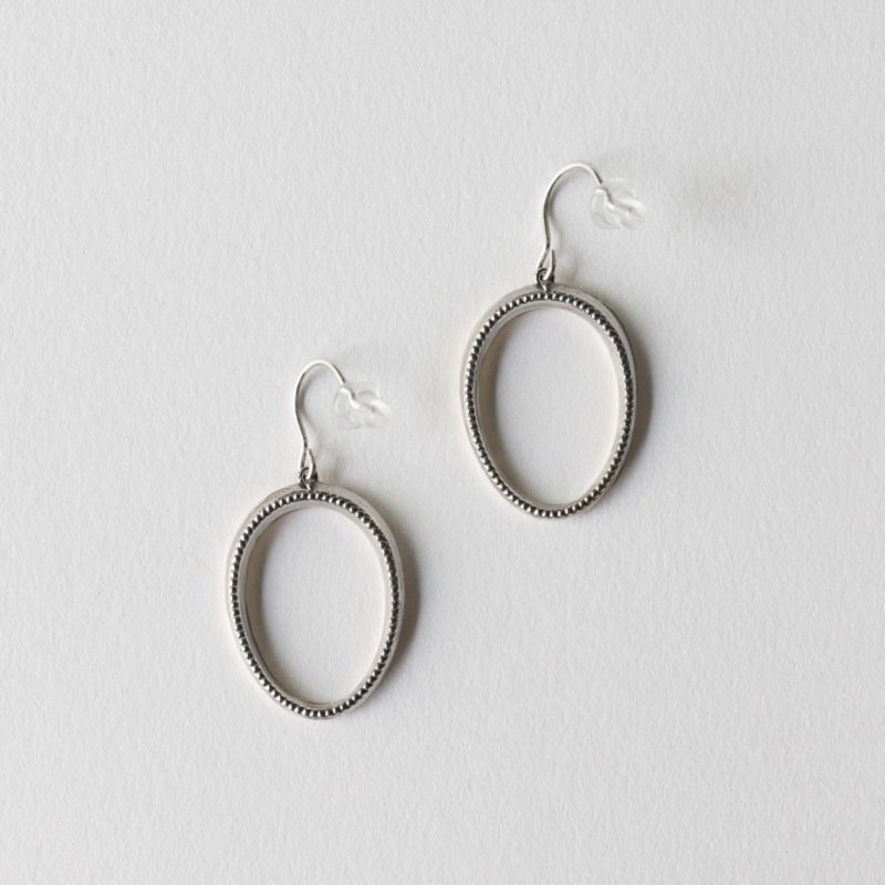 SSSとはSmall Sewing Scissorsの略。出会ったアンティークの糸切ばさみのシルエットやシルバーの美しさに惹かれ、その持ち手をモチーフにして生まれたシリーズ。ミル打ち(小さな粒を連続して打刻する装飾技法)により施されたエッジ部分の模様がアクセントとなり、耳元を美しく彩ります。お手入れをしながら育てるシルバー
