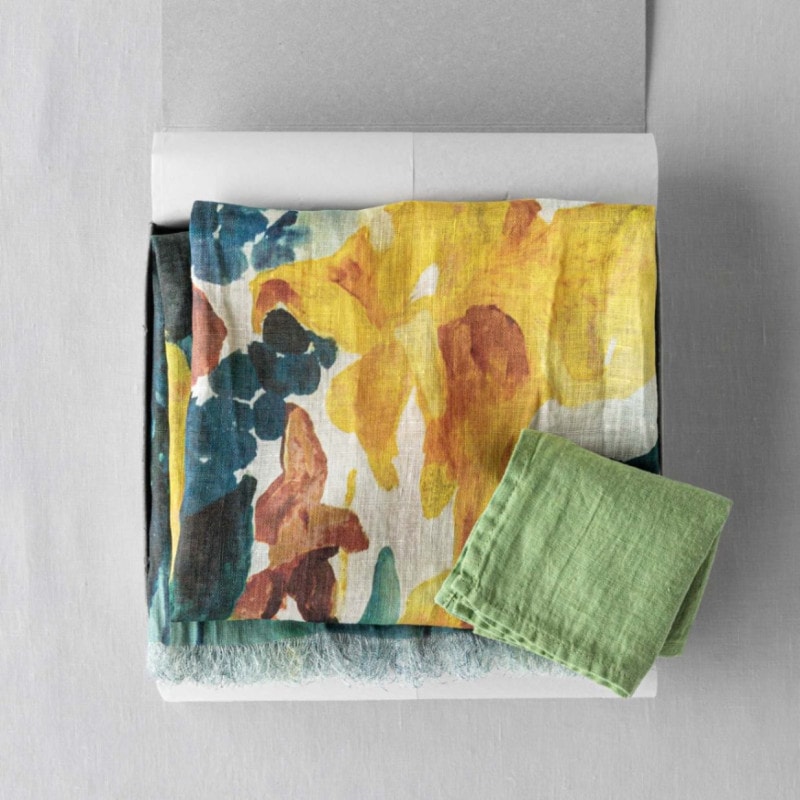 アーティスティックな柄が印象的なリネンショールと、鮮やかなグリーンのハンカチをセットにしました。