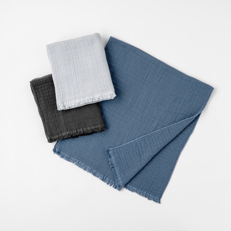太さの異なる2種類の緯糸を不規則な配列で織り込み、変則的な4重構造に仕上げることで、生地の立体感とソフトな手触りを生み出しています。ギフトにもおすすめなデザイン
