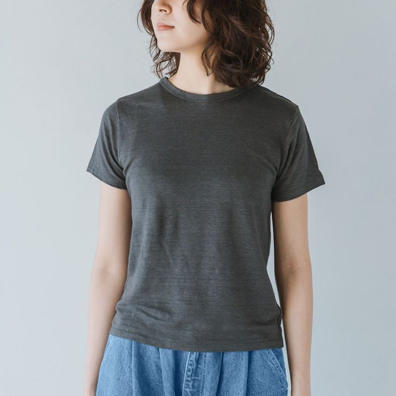 リネンを贅沢に100%使用したニットTシャツ。汗をかいても肌にべたつかず、さらりとした着心地。おうちでも外でも気負わず着られて、きちんと見える。そんなちょうどいいバランスが魅力です。