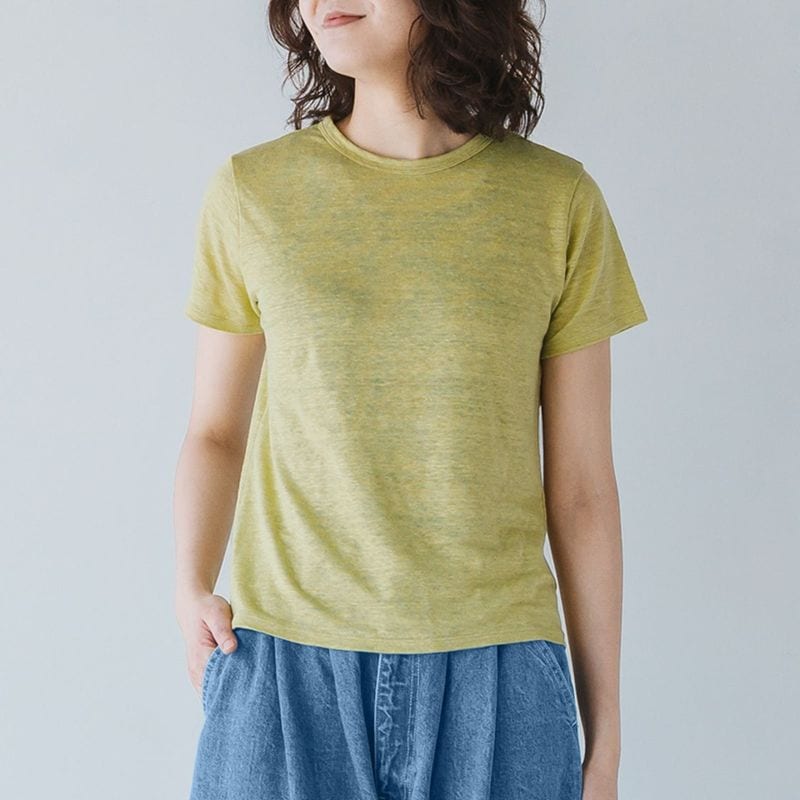 リネンを贅沢に100%使用したニットTシャツ。汗をかいても肌にべたつかず、さらりとした着心地。おうちでも外でも気負わず着られて、きちんと見える。そんなちょうどいいバランスが魅力です。