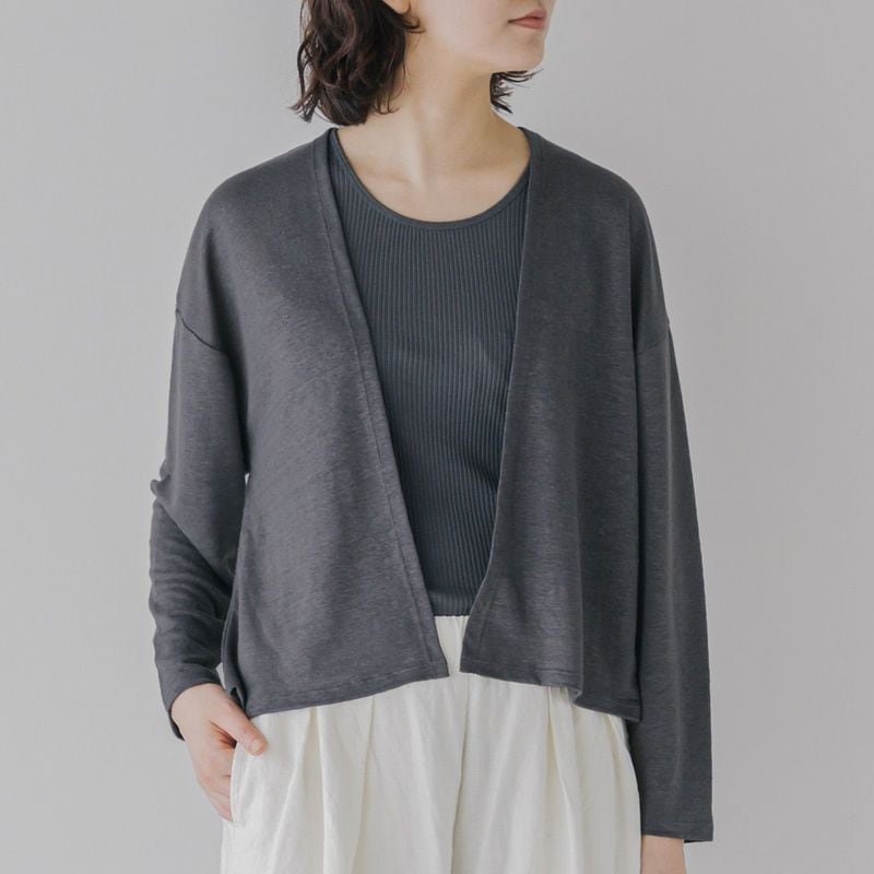 リネンを贅沢に100%使用したニットカーディガン。ボタンレスでさっと羽織りやすく、おうちでも外でも気負わず着られて、きちんと見える。そんなちょうどいいバランスが魅力です。