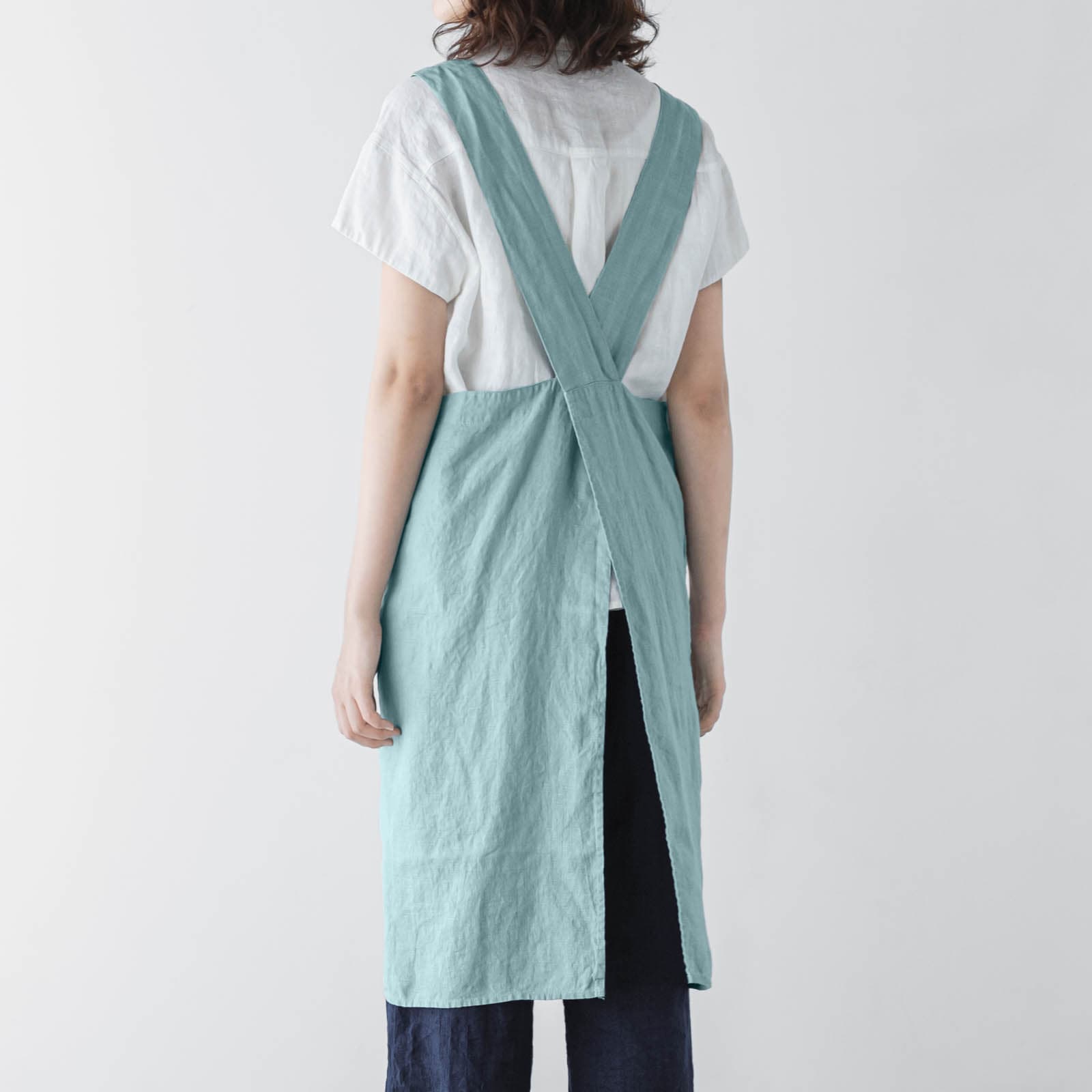 幅広の肩紐が後ろで交差します。後ろ姿も魅力のエプロンです。